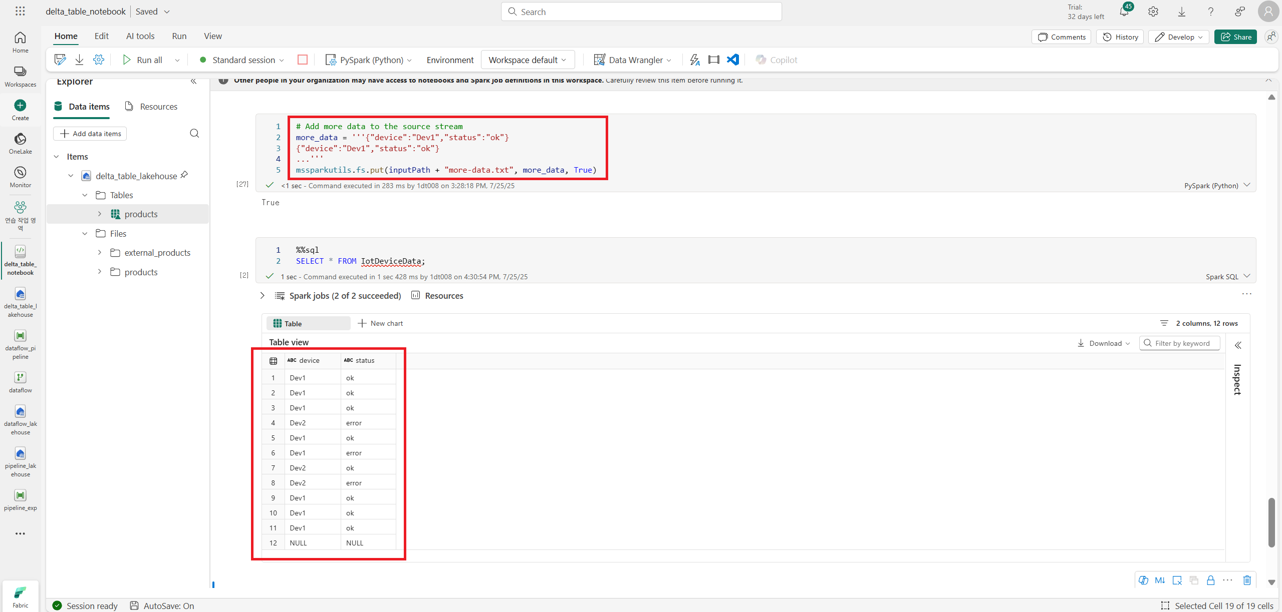 .start(delta_stream_table_path): 스트림 쓰기를 Tables/iotdevicedata 경로로 시작한다.