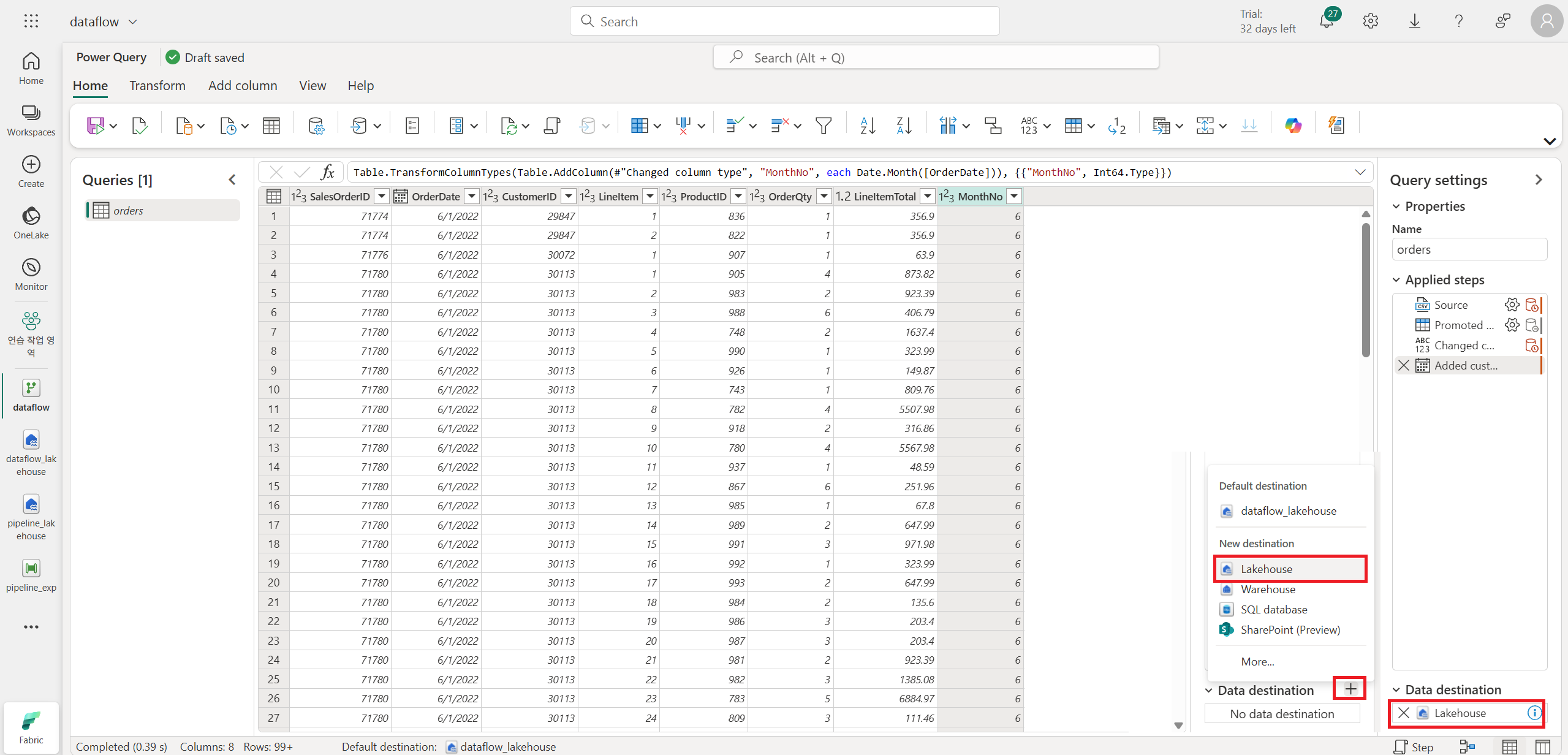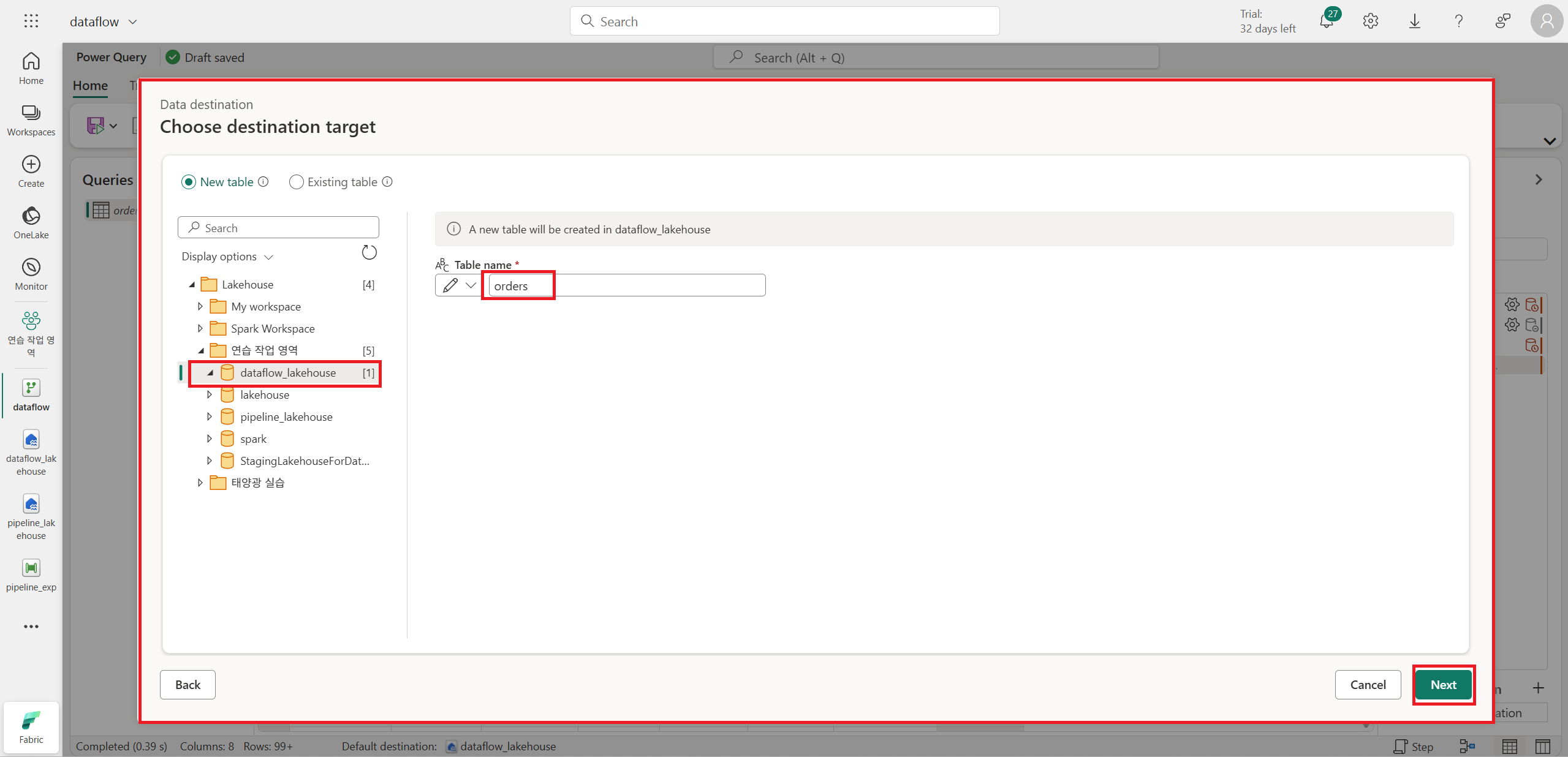 자신이 연결할 lakehouse와 선택하고 테이블 이름을 설정한다.