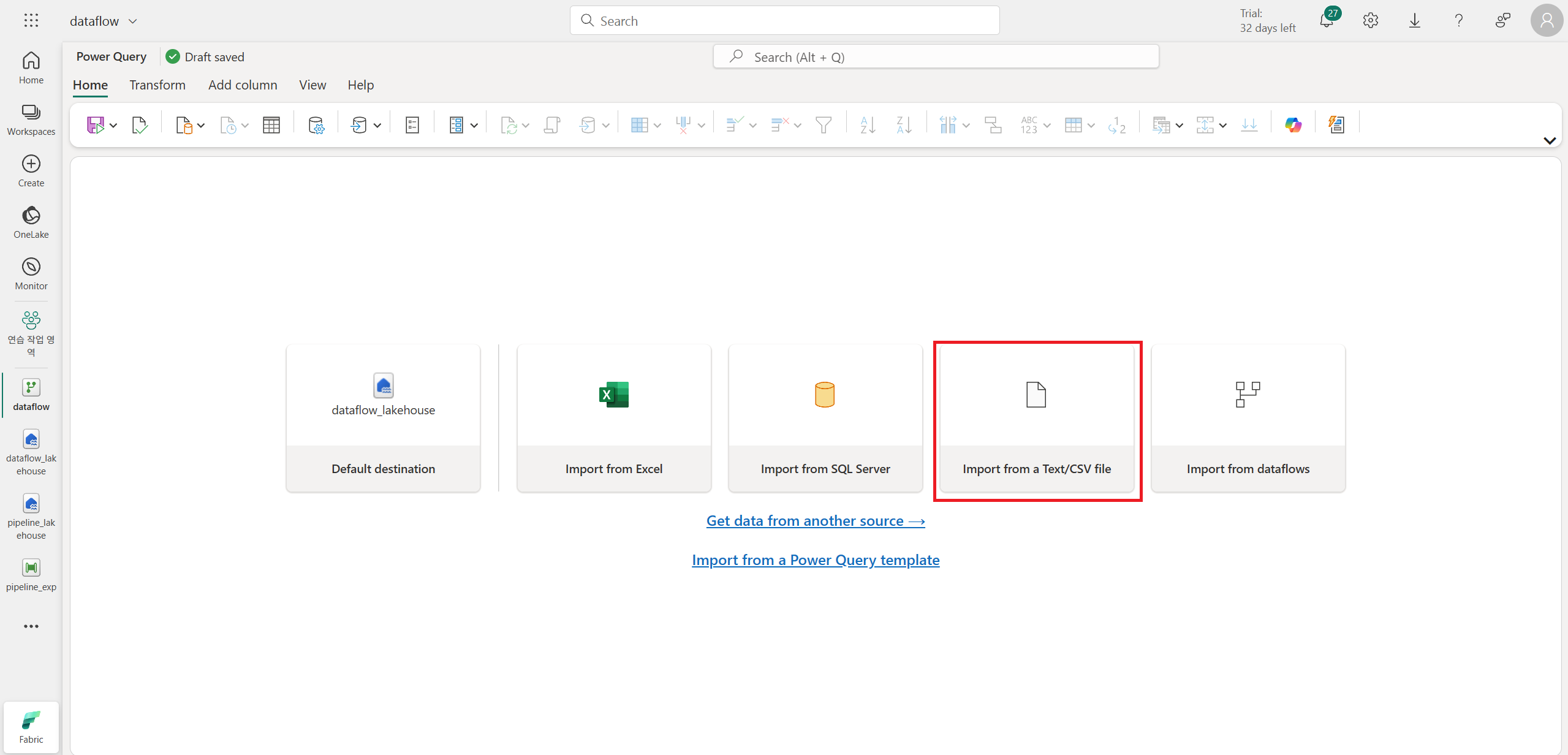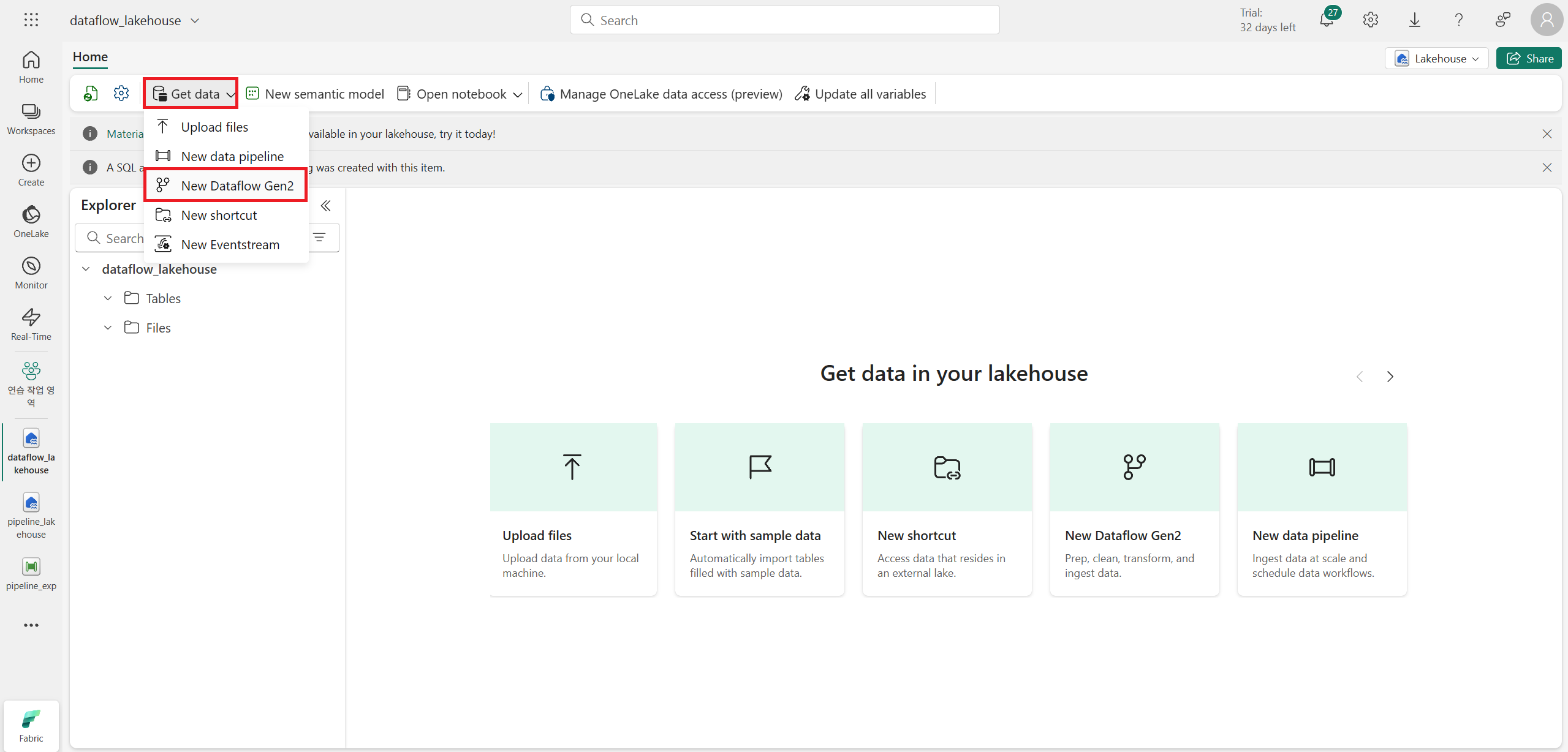 Dataflow 실습용 lakehouse를 생성한다. 그리고 Get data에서 Dataflow를 생성한다.