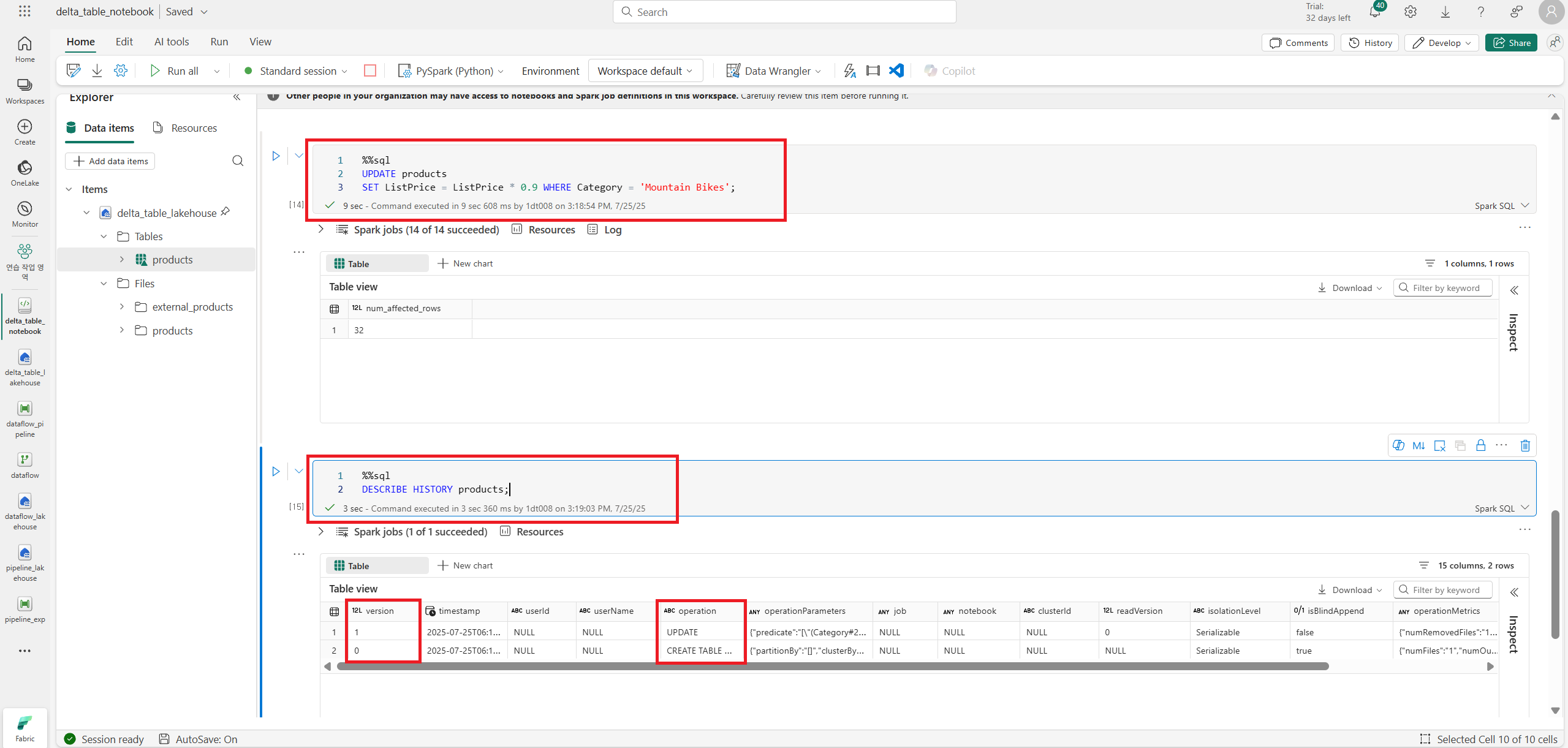 이후 DESCRIBE HISTORY your_table_name;으로 트랜잭션 로그를 볼 수 있다.