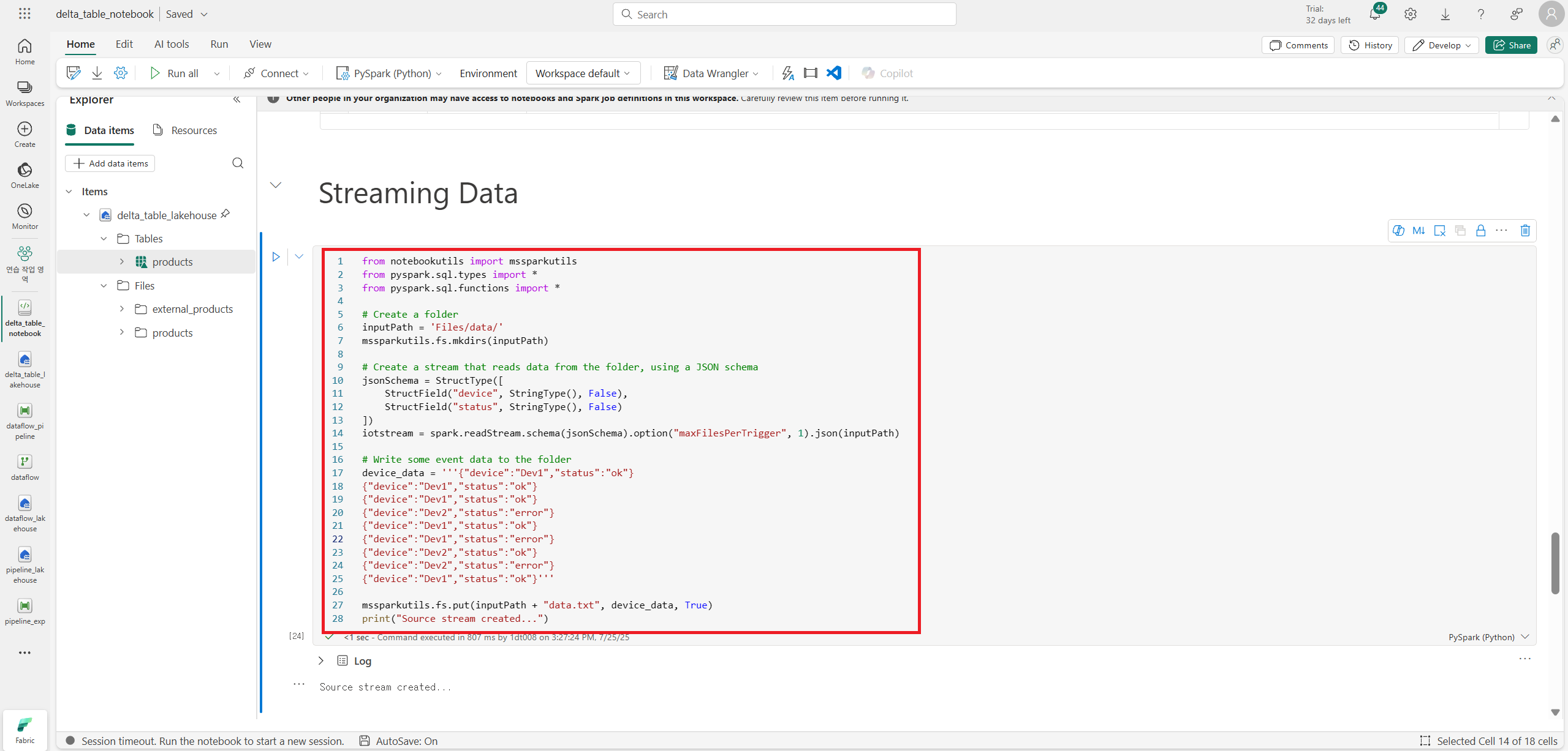 스트리밍 source를 지정한 다음, 위 화면처럼 스트림 데이터를 delta table로 보낸다.