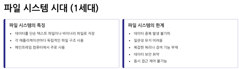 | 1세대 | 파일 시스템 | 1960년대 초 | 단순 파일 기반 데이터 저장 | ISAM, VSAM |