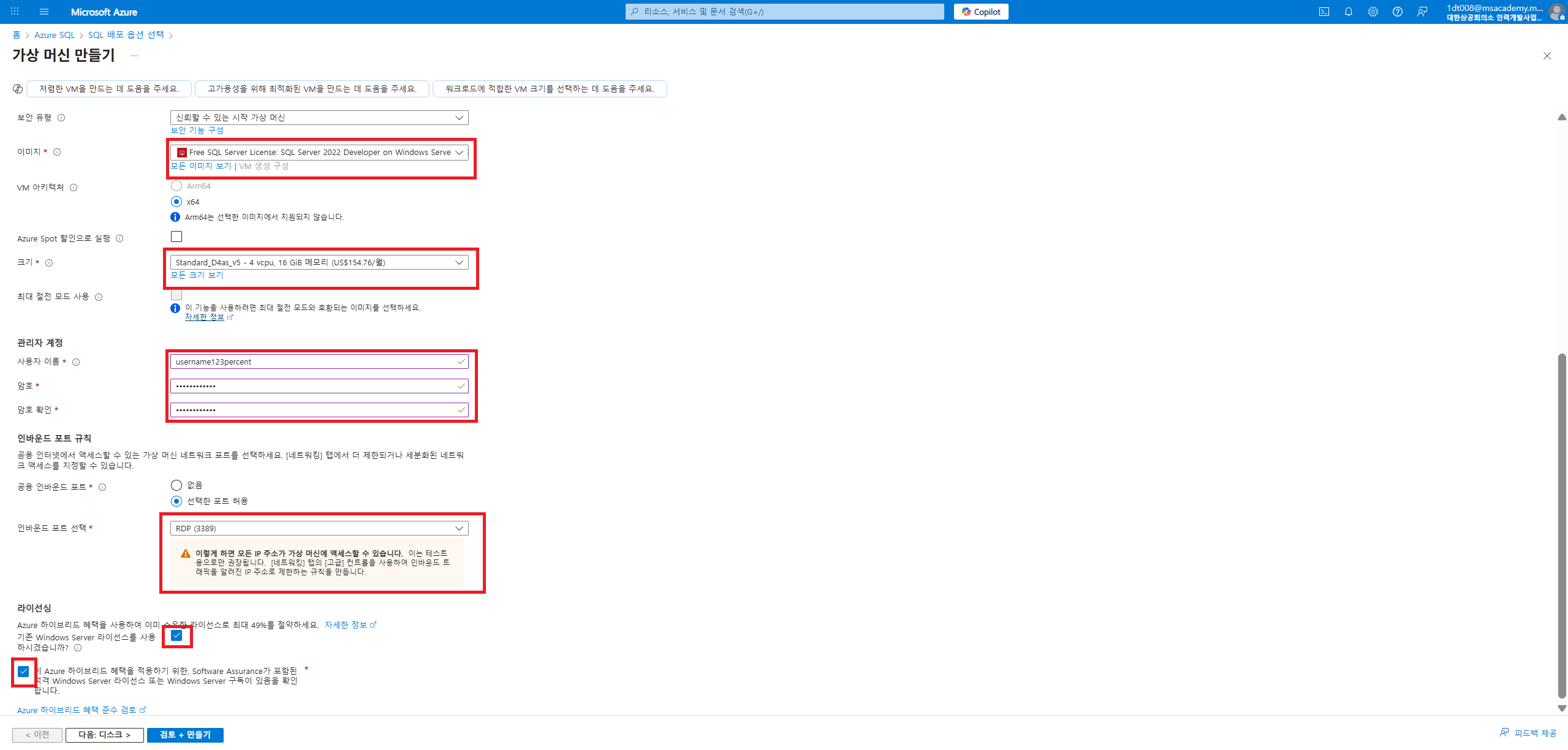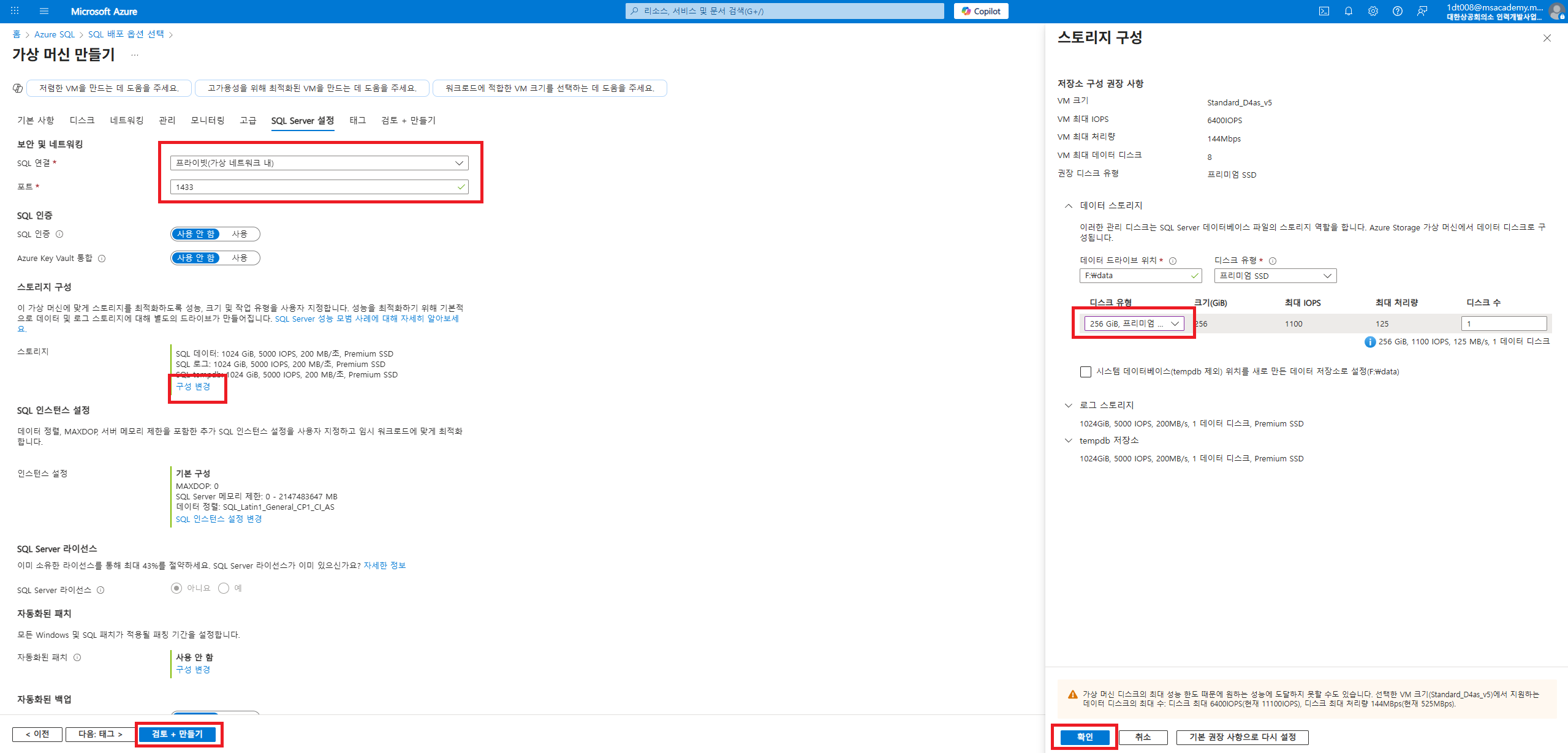 SQL VM을 만드는 세부 설정이다. 본인의 사양에 맞는 자원을 선택한다.