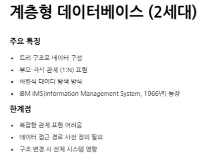 | 2세대 | 계층형 | 1960년대 중 | 트리 구조, 부모-자식 관계 | IBM IMS |