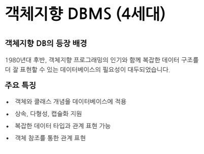 | 5세대 | 객체지향, 객체관계형 | 1990년대 | 객체 모델, 복잡한 데이터 처리 | PostgreSQL, ObjectStore |
